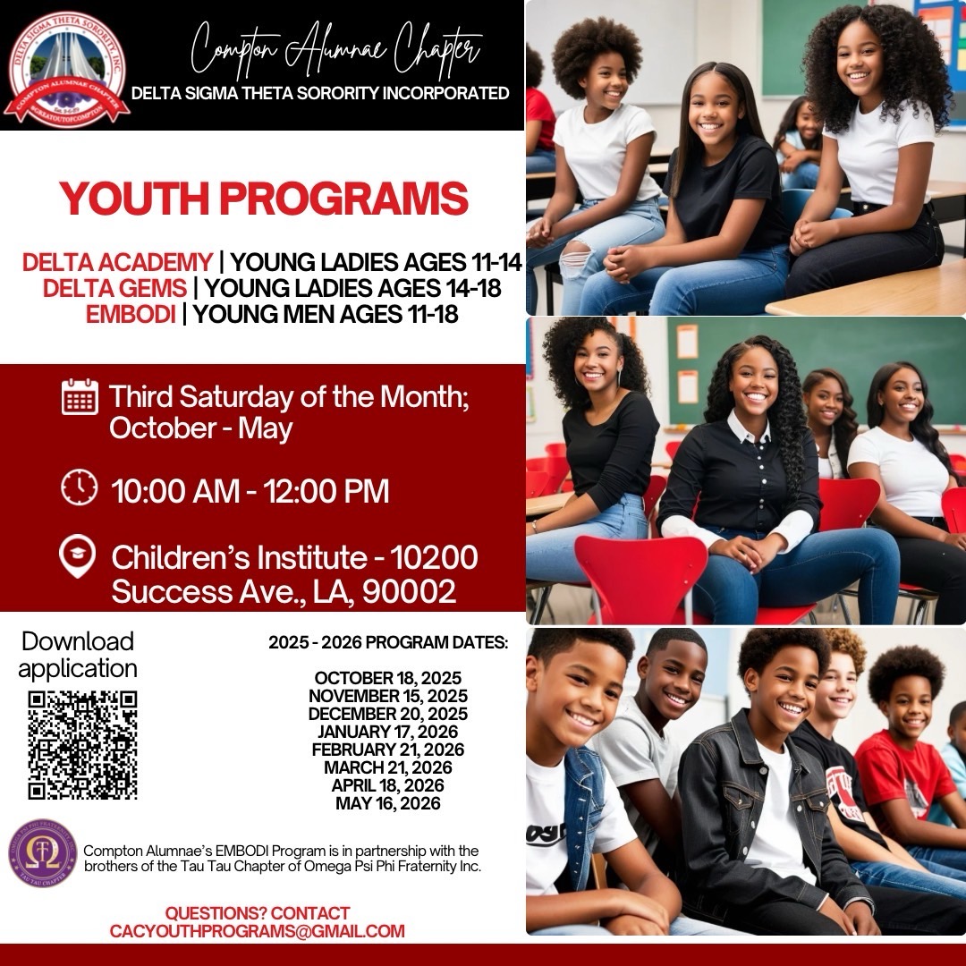 Since its founding in 1913, Delta Sigma Theta has clearly distinguished itself as a public service organization that boldly confronts the challenges of African Americans and, hence, all Americans. Over the years, a wide range of programs addressing education, health, international development, and strengthening of the African American family have evolved. In realizing its mission, Delta Sigma Theta provides an extensive array of public service initiatives through its Five-Point Programmatic Thrust of Economic Development, Educational Development, International Awareness and Involvement, Physical and Mental Health, and Political Awareness and Involvement. The Compton Alumnae Chapter strives to implement programs that fall under our National Guidelines.
